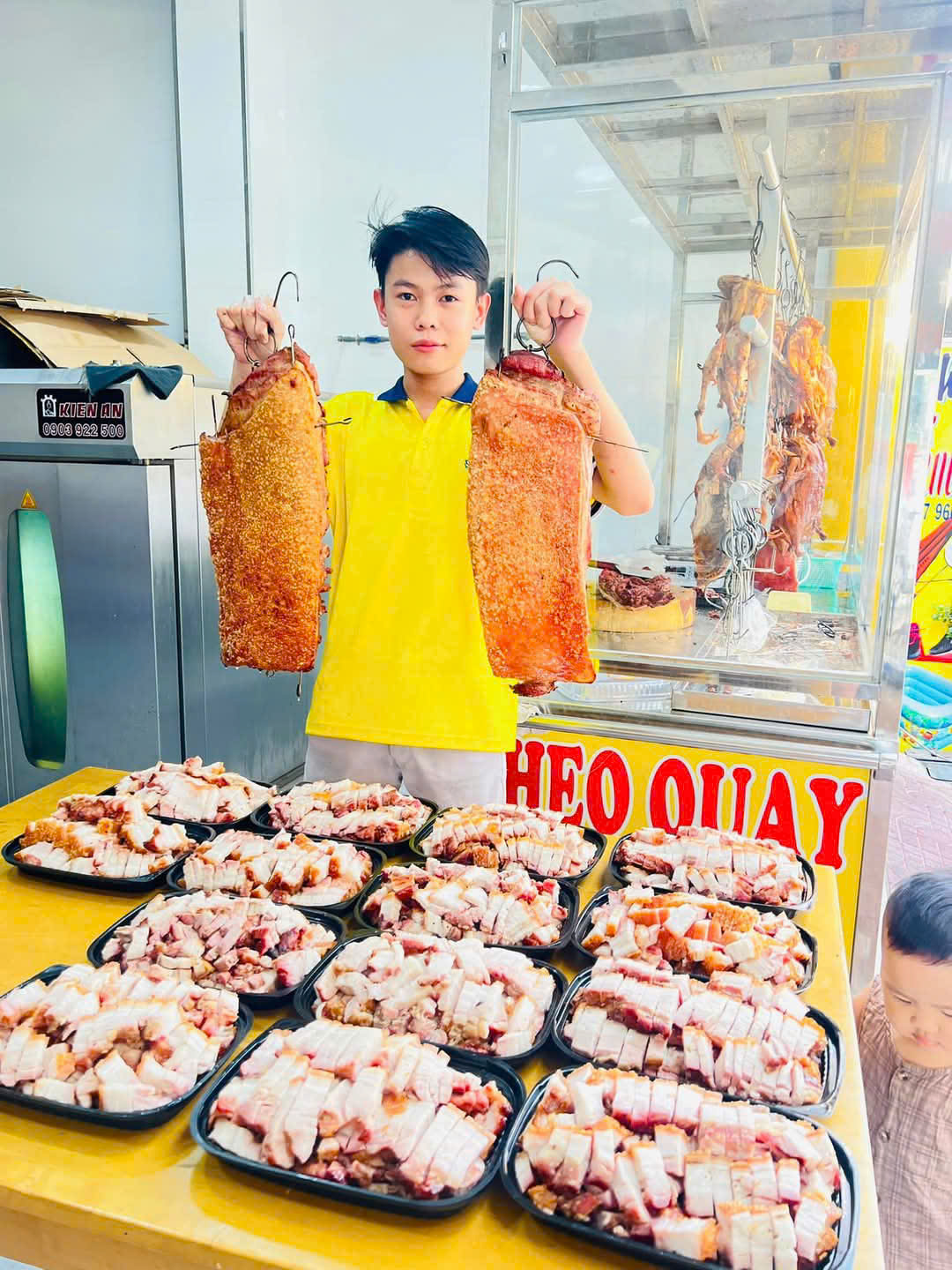 Heo quay được chế biến từ heo tươi trong ngày, quay bằng lò than đỏ lửa trong nhiều giờ giúp phần da nổ giòn rụm, vàng óng bắt mắt, lớp thịt bên trong chín đều, mềm mại và đậm đà hương vị. Thịt được tẩm ướp gia vị theo công thức riêng, không bị khô hay ngấy, ăn kèm với dưa chua hoặc bánh hỏi đều rất ngon.